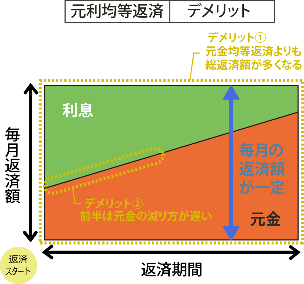 デメリットは、同じ返済期間の場合、元金均等返済よりも総返済額が多くなります。
