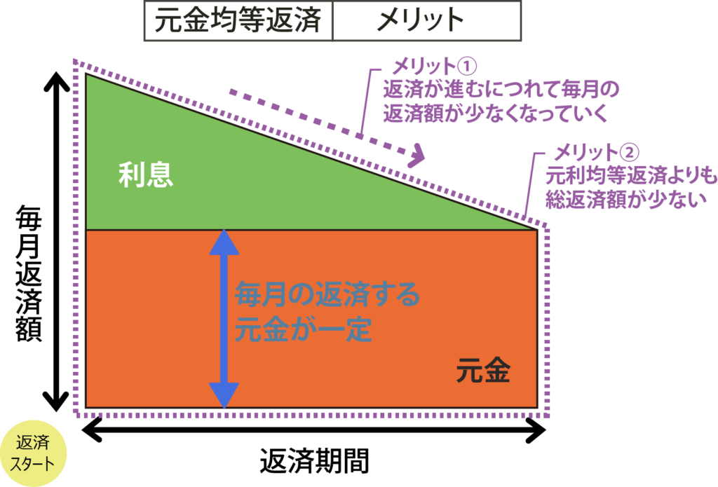 メリットは、返済が進むにつれて毎月の返済額(元金+利息)は少なくなることです。