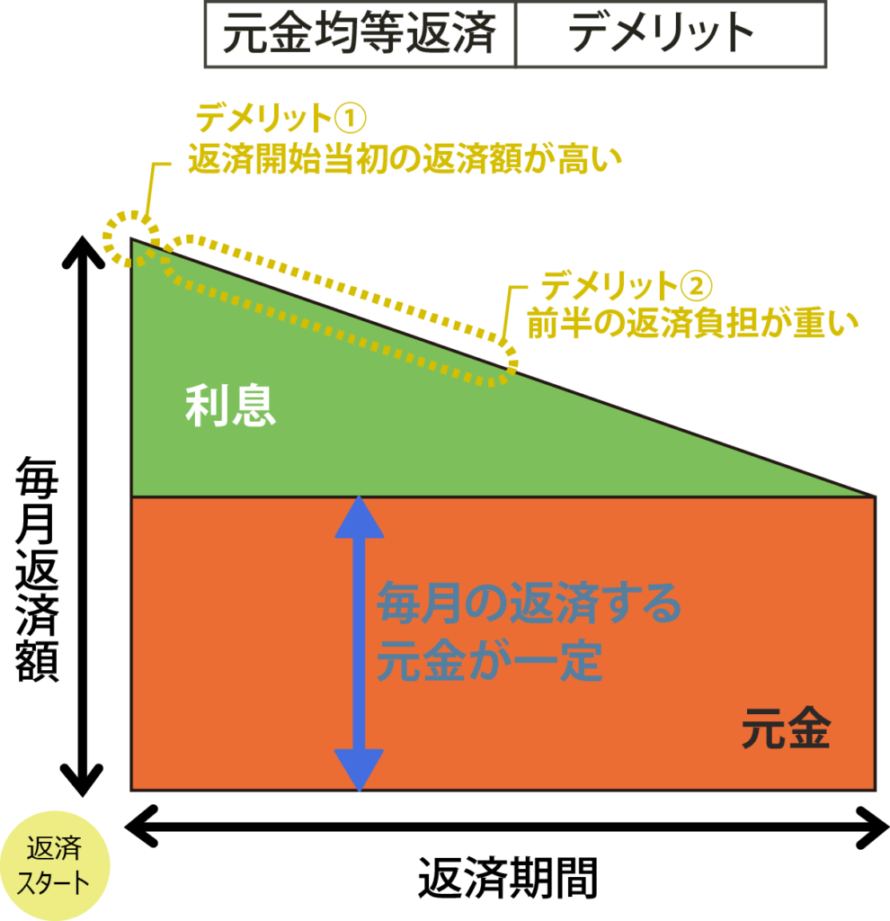 デメリットは、元利均等返済に比べて、返済開始当初の返済額が高くなるので、返済期間の前半では返済負担が重くなることです。