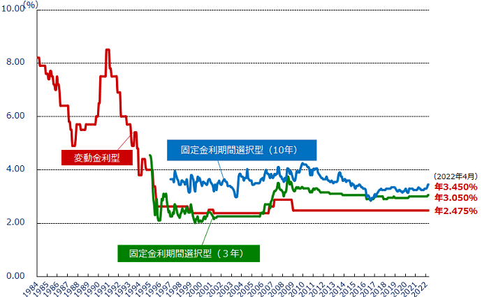 - 将来の貸出し金利が下がっても、契約した当初の金利が変わることはない (借り直しや交渉で下げることができる可能性はあります)