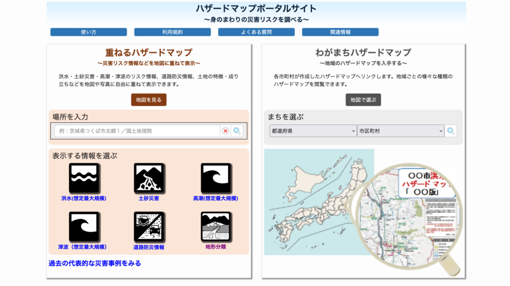 国土交通省の国土地理院が運営しているハザードマップポータルサイトでは、「重ねるハザードマップ」と「わがまちハザードマップ」の2種類のハザードマップが利用できます。