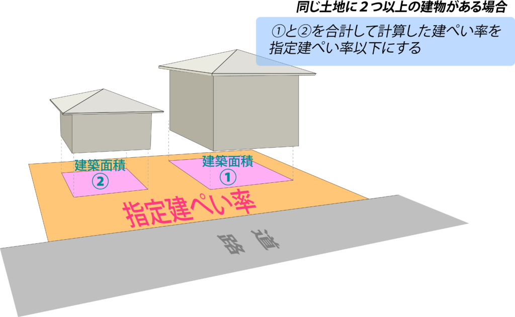 同じ土地に2つ以上の建物がある場合は、それぞれの建物の建築面積を合計した値が敷地面積に対する割合になります。