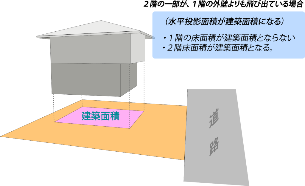 ですので、1階の床面積と2階の床面積を合計した値は建築面積ではありませんので注意が必要です。
