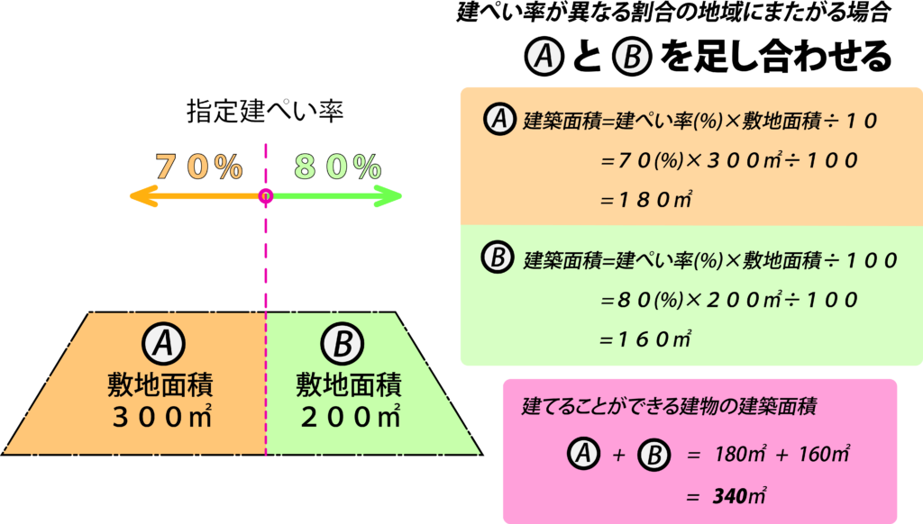建ぺい率が70%の割合の地域と80%の割合の地域とにまたがっている場合は、180㎡ と160㎡を合計した340㎡ (建築面積) までの建物を建てることができます。