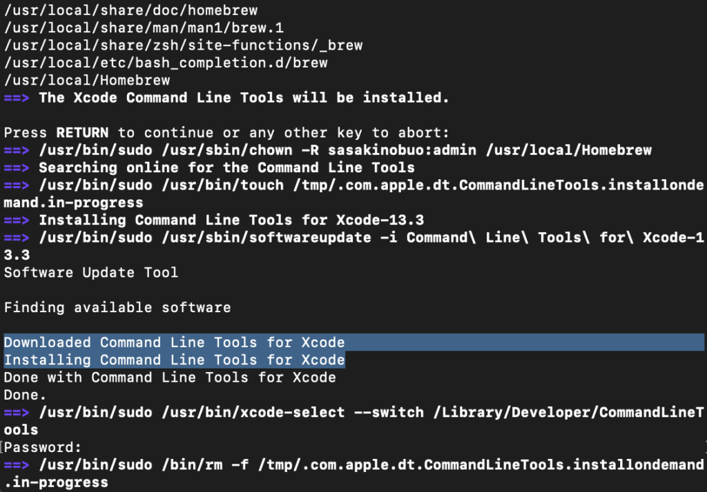 Installing Command Line Tools for Xcode と表示されたら、焦らずじっと待つ。