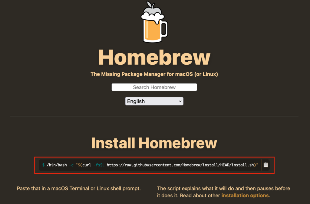『Install Homebrew』と書いてあるすぐ下のスクリプトをコピーし、それをターミナルにペースト。そしてリターンキー(エンター)を押す。