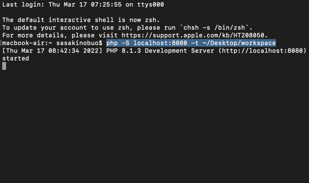 ビルトインサーバーを立ち上げるコマンドをターミナルに入力します。