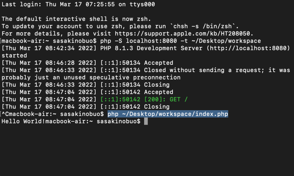 コマンドでPHPの後ろに実行したいファイルパスを指定すれば、サーバーを立ち上げることなく、ターミナルでも実行結果を確認することができます。